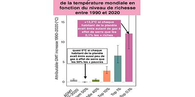 Restons dans les différences entre humains. Un axe fort, le lien empreinte avec richesse et mode de vie associé. Si nous avions émis depuis 1990 autant que le 0.1% des plus riches, l'augmentation de température serait déjà de 12,2°. Et elle n'aurait quasi pas bougé si nous avions émis comme les 50% les plus pauvres. Le lien justice sociale et climat est bien là. Le traiter est une autre histoire