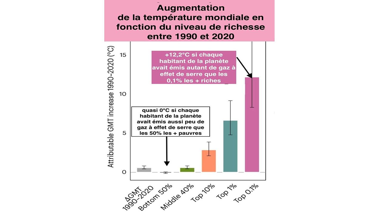 Restons dans les différences entre humains. Un axe fort, le lien empreinte avec richesse et mode de vie associé. Si nous avions émis depuis 1990 autant que le 0.1% des plus riches, l'augmentation de température serait déjà de 12,2°. Et elle n'aurait quasi pas bougé si nous avions émis comme les 50% les plus pauvres. Le lien justice sociale et climat est bien là. Le traiter est une autre histoire